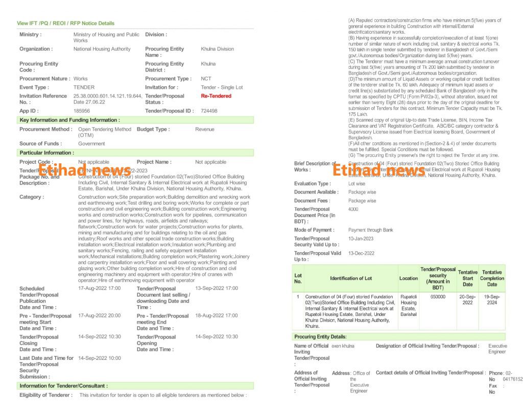 জাতীয় গৃহায়ন কর্তৃপক্ষের খুলনা বিভাগের অধীনে বরিশাল উপ বিভাগের জন্য রুপাতলী হাউজিং এস্টেটে চার তলা ফাউন্ডেশন এবং দু'তলা অফিস ভবন নির্মান ও অভ্যান্তরীন স্যানিটারি ও বৈদ্যুতিক কাজের দরপত্র আহবান করা হয় ২০২২ সালের ১৭ আগষ্ট।